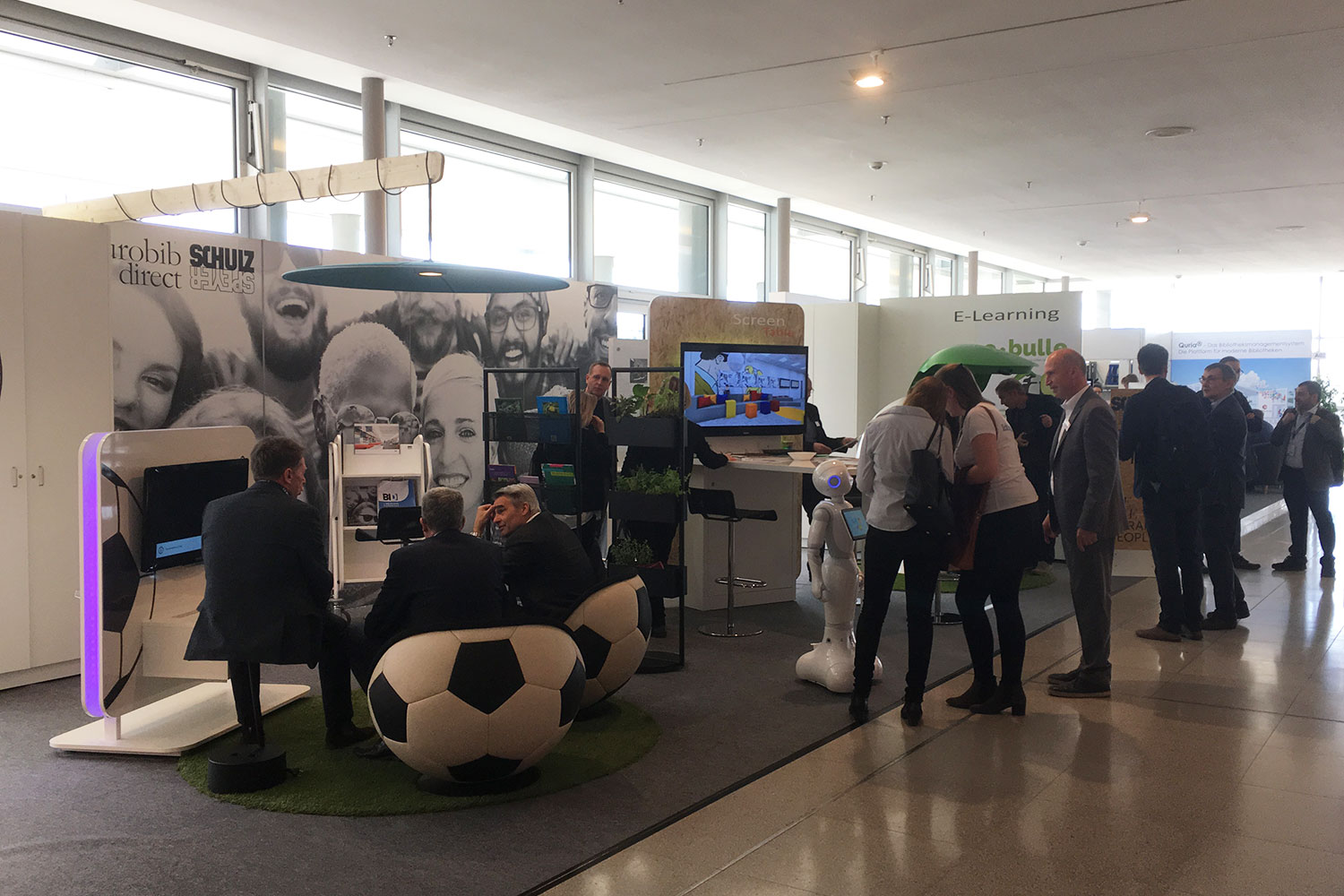 Auch Pepper, unser Roboter auf dem Stand sorgte für lebhaftes Interesse bei den Besuchern. Er kann unterhalten, aber auch hilfreich dem Nutzer bei seinem Besuch in der Bibliothek zur Seite stehen. Der E-Bulle sorgt für eine Raum in Raum Lösung für eine Person. Im E-Bulle kann man sich konzentriert zurückziehen und am integrierten Bildschirm arbeiten, telefonieren aber auch bei Videos entspannen oder Sprachen lernen.