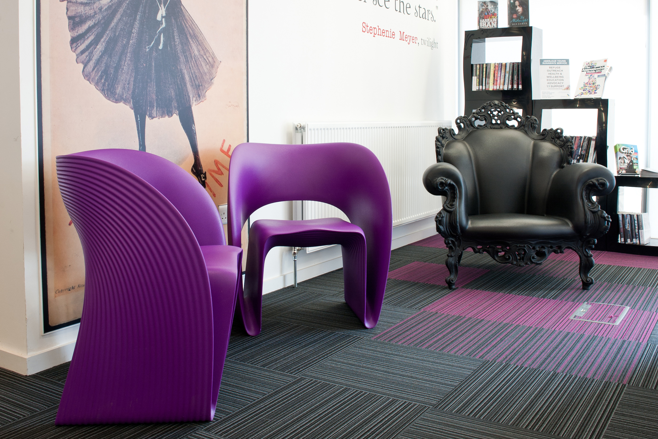 Die Hauptthemen und Bereiche der Bibliothek werden durch Grafiken und Schilder aufgewertet, die mit Genehmigung der Hofdichterin der Kinder, Julia Donaldson, verwendet werden. Dabei setzten wir ihre beliebten Gruffalo-Darstellungen als Wandgrafiken in der Kinderabteilung ein und führten dieses Thema bis hin zu den maßgeschneiderten Minimöbeln weiter.