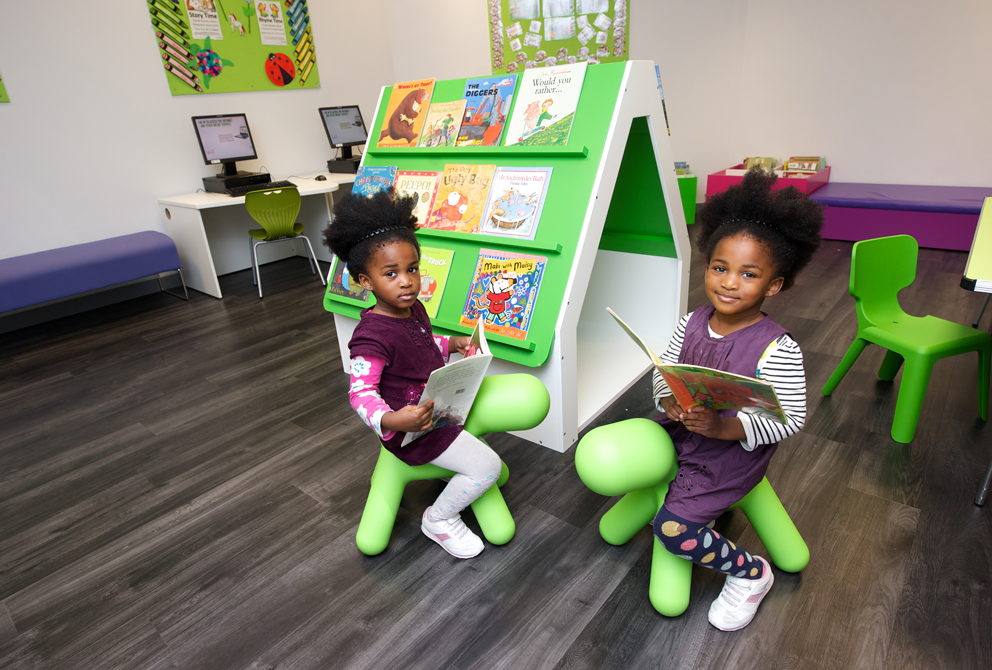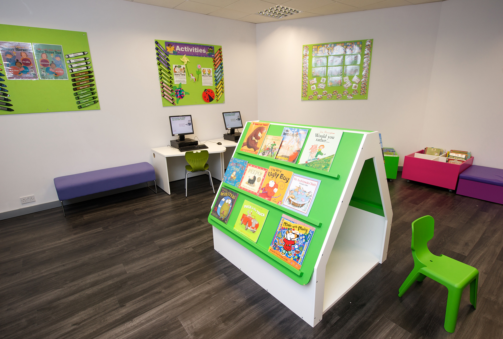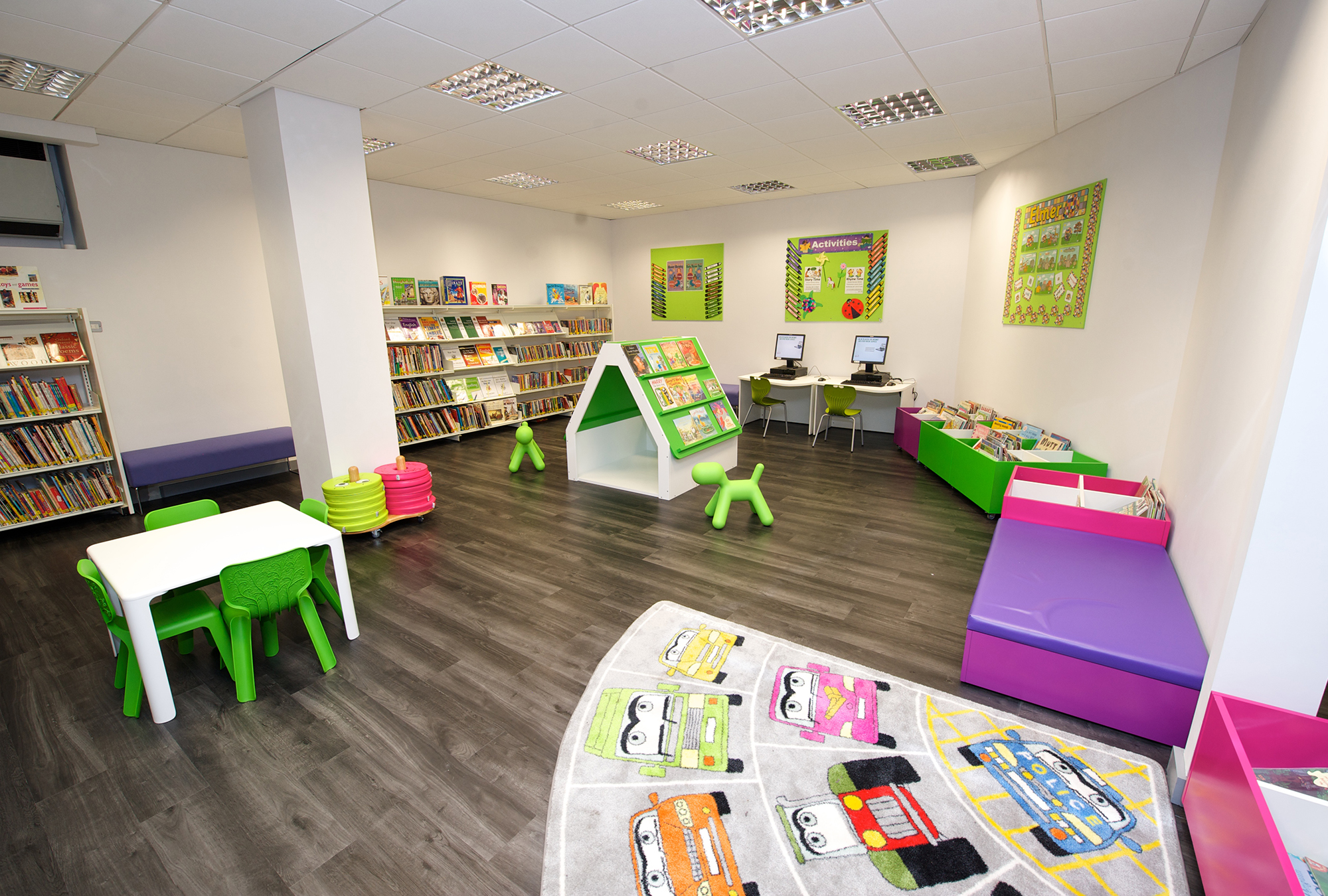 Die Bibliothek, in gemeinsamer Unterbringung mit dem Thamesmere Leisure Centre, war jedoch von diesem durch eine Wand abgetrennt. Als der Hauptempfangsbereich zur Renovierung anstand, hat unser Kunde, Diana Edmonds, Leiterin der Bibliotheken in Greenwich, die Gelegenheit wahrgenommen, dass auch die Bibliothek eine Auffrischung und Umgestaltung erfährt. Ihre Vision war es, die Grenzen zwischen Bibliothek und Leisure Centre aufzuheben und die Bibliothek in direkter Front vor den in dem Centre angebotenen Diensten zu positionieren.