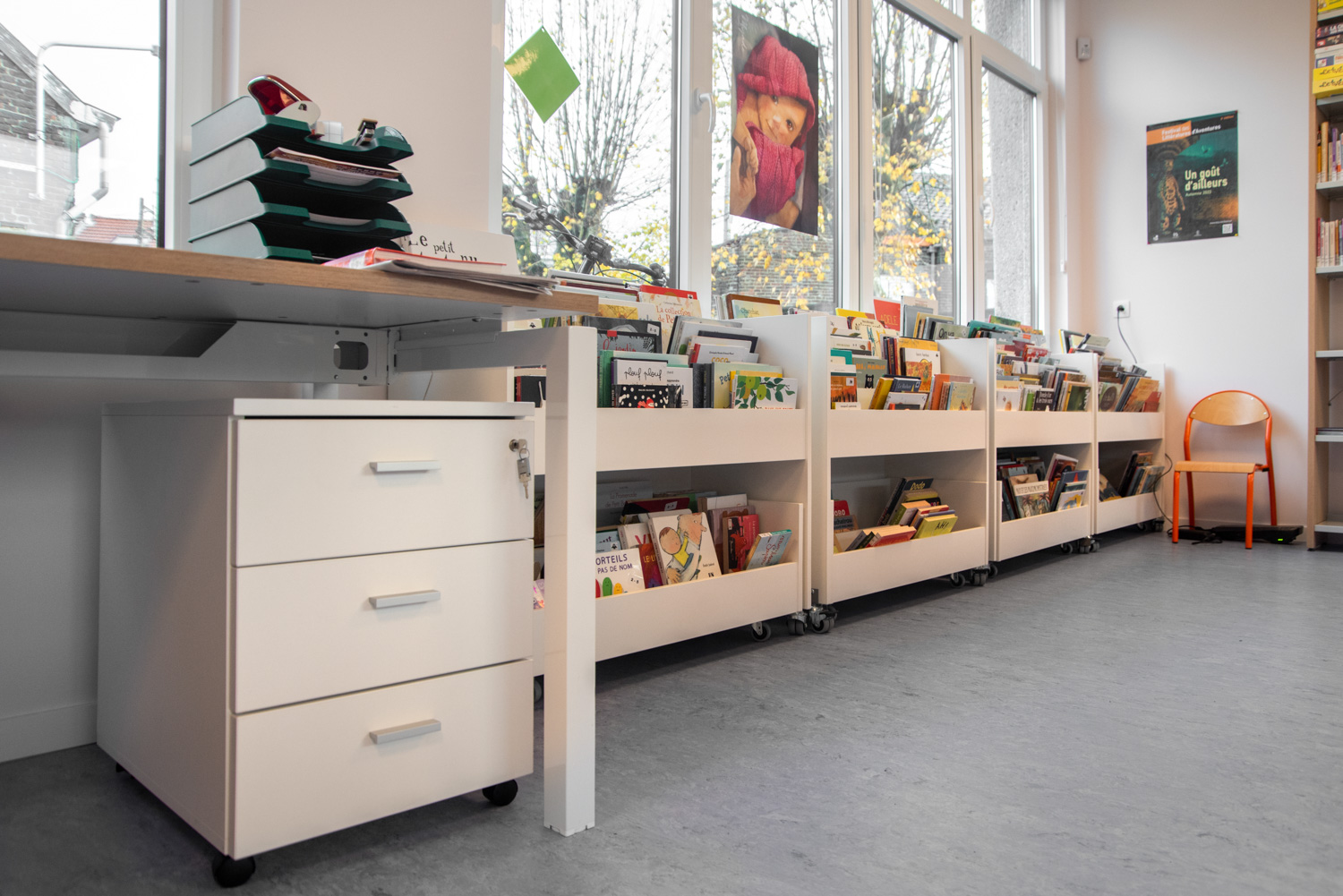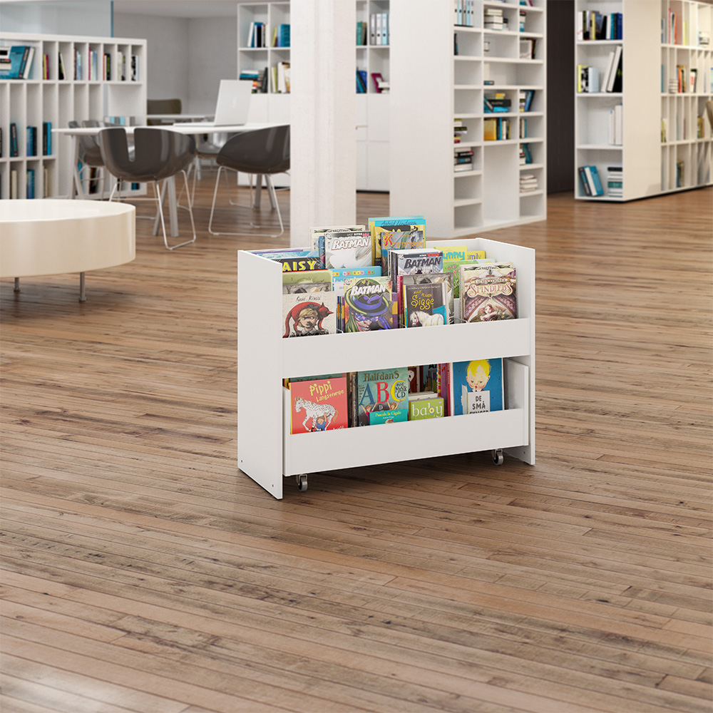 Beliebter Bilderbuchtrog mit drei Präsentationsfächern jeweils mit zwei verstellbaren Trennwänden und Aufbewahrungsschubladen mit zwei Fächern auf Rollen im unteren Bereich.