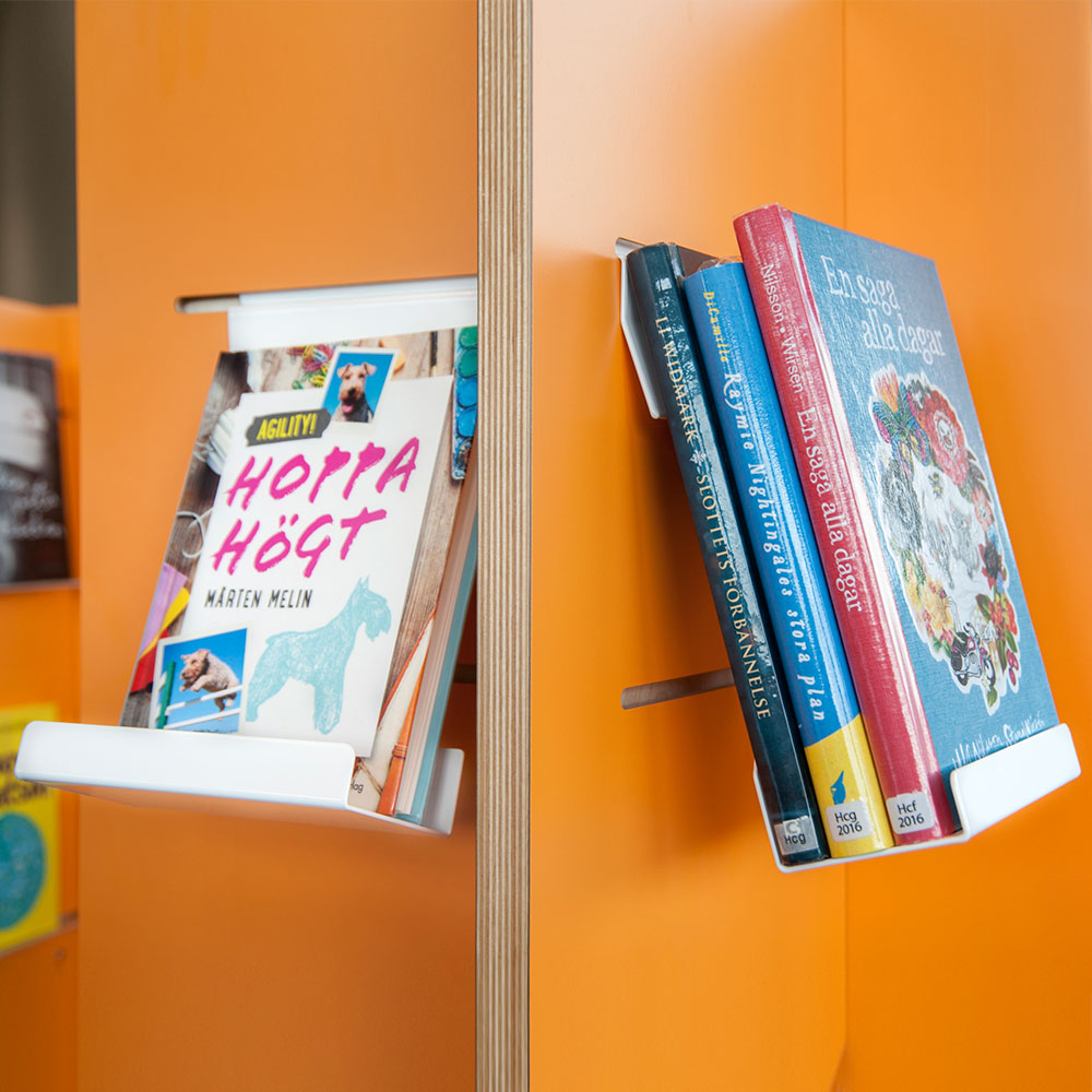 Die Halter lassen sich leicht bewegen, um flexible Ausstellungslösungen für Bücher, AV-Media wie CD/DVDs, Magazinen, Brochuren, usw. zu erstellen.