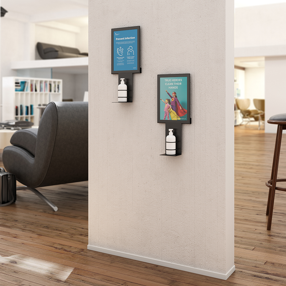 Wandmontierter Spender für Handdesinfektion mit A4 magnetischem Rahmen für einfachen Tausch der Beschriftung.