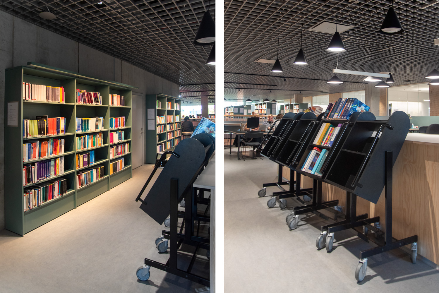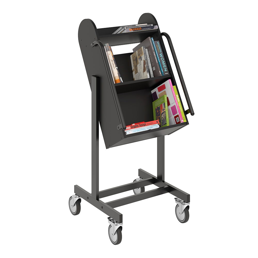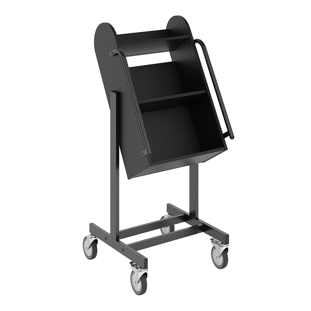 Die Neigung des Bücherwagens sorgt für eine sichere Medienunterbringung und bietet eine gute Übersicht über die jeweiligen Bücher.