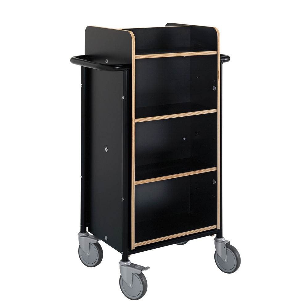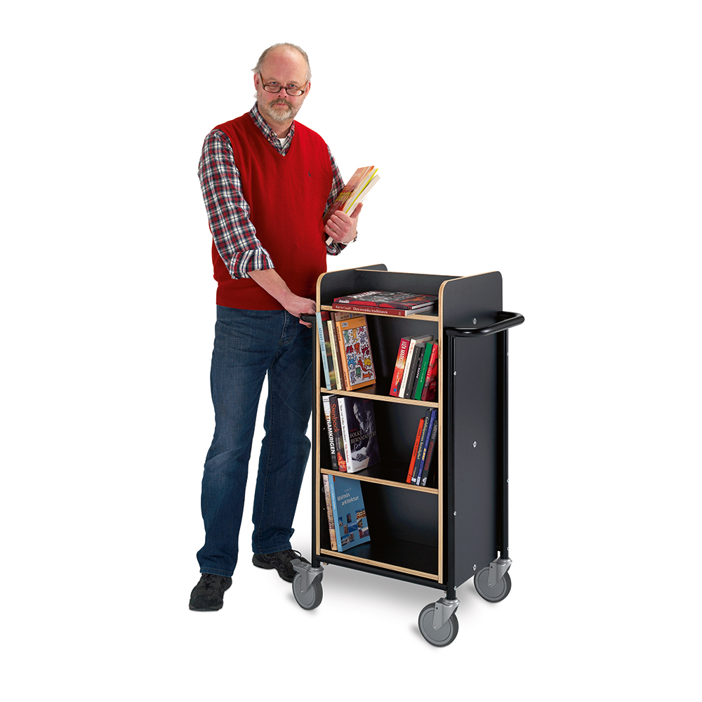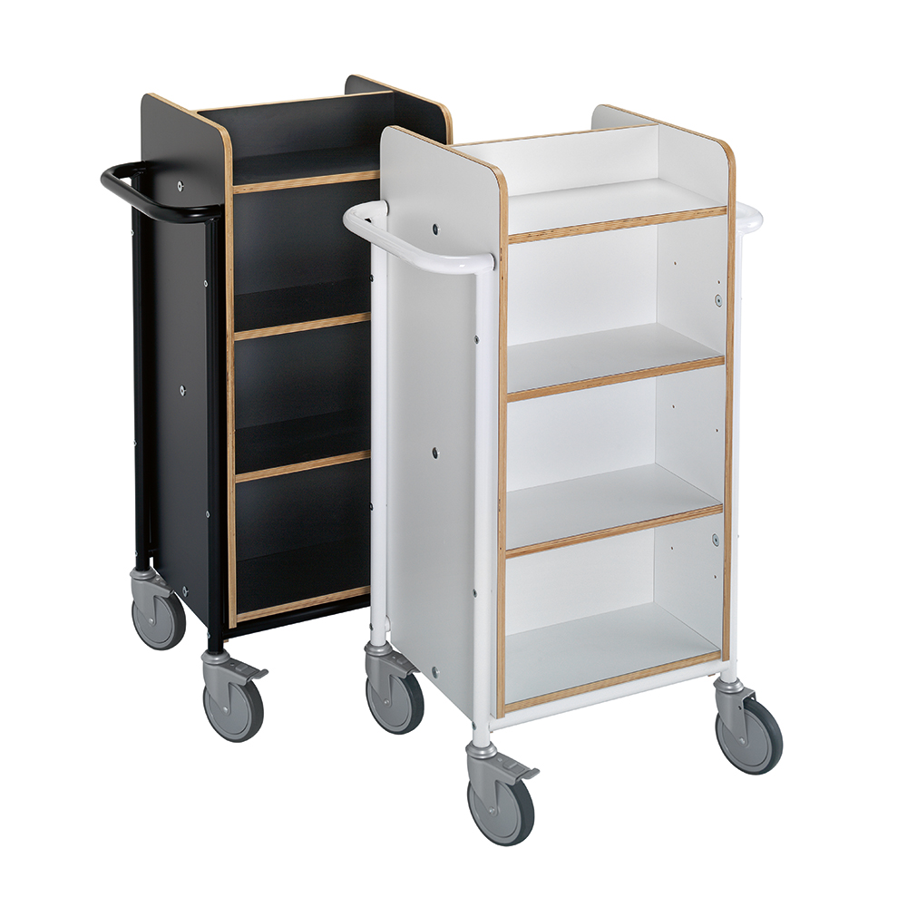 Funktioneller, doppelseitiger Wagen mit acht Fachböden. Sechs Fachböden sind versetzbar und können an der Größe der Medien angepasst werden.