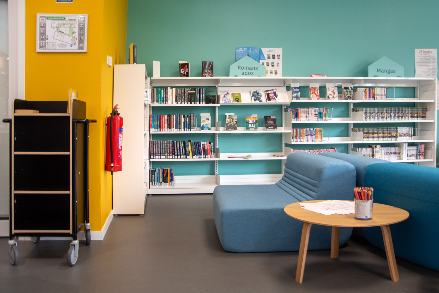 Diesen Bücherwagen kann man als fahrbares Miniregalsystem einsetzen - überall in der Bibliothek, wo es gerade gebraucht wird.