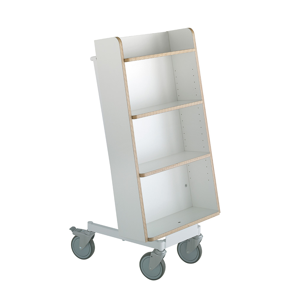 Die Neigung des Bücherwagens sorgt für eine sichere Medienunterbringung und bietet eine gute Übersicht über die jeweiligen Bücher.
