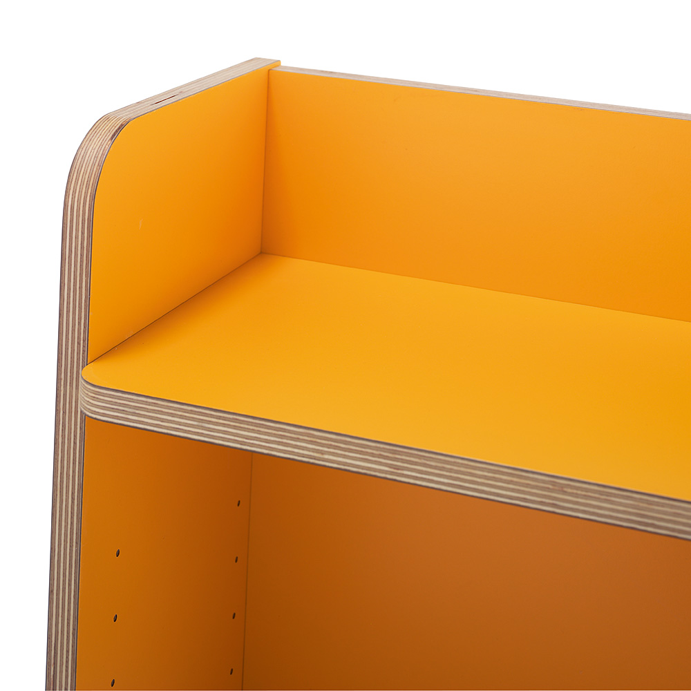 Hier geht es um laminiertes Birkensperrholz, auf dem Foto mit sichtbaren Kanten. Damit lassen sich eine strapazierfähige Oberfläche und eine langlebige Konstruktion erzielen. Ideal für die meisten stark beanspruchten Bibliotheksumgebungen!