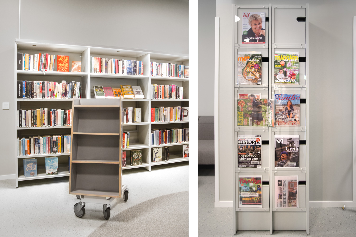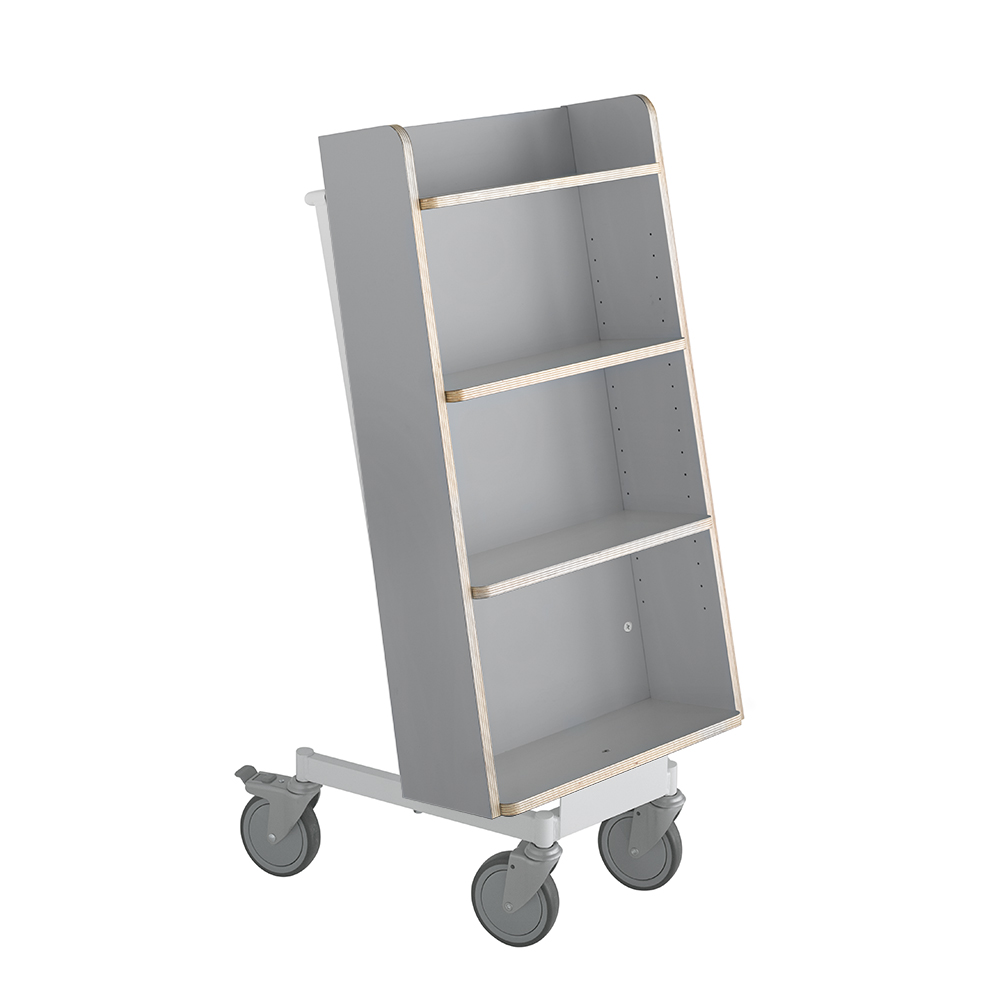 Die Neigung des Bücherwagens sorgt für eine sichere Medienunterbringung und bietet eine gute Übersicht über die jeweiligen Bücher.