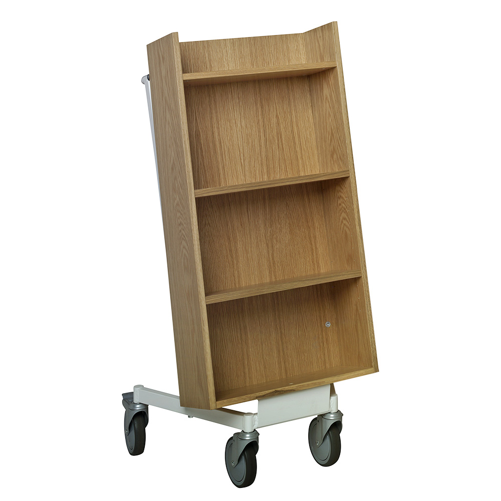 Die Neigung des Bücherwagens sorgt für eine sichere Medienunterbringung und bietet eine gute Übersicht über die jeweiligen Bücher.