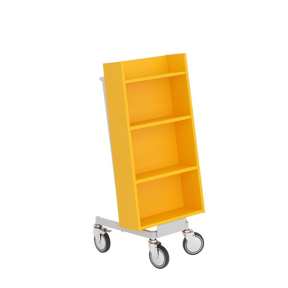 Die Neigung des Bücherwagens sorgt für eine sichere Medienunterbringung und bietet eine gute Übersicht über die jeweiligen Bücher.