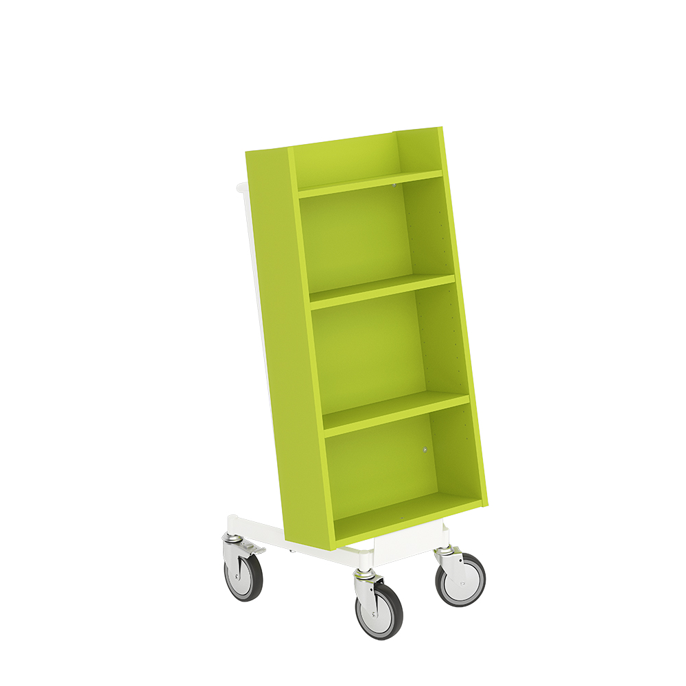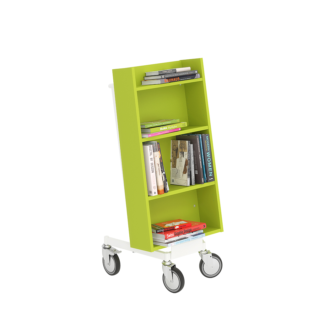 Die Neigung des Bücherwagens sorgt für eine sichere Medienunterbringung und bietet eine gute Übersicht über die jeweiligen Bücher.