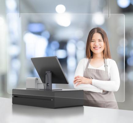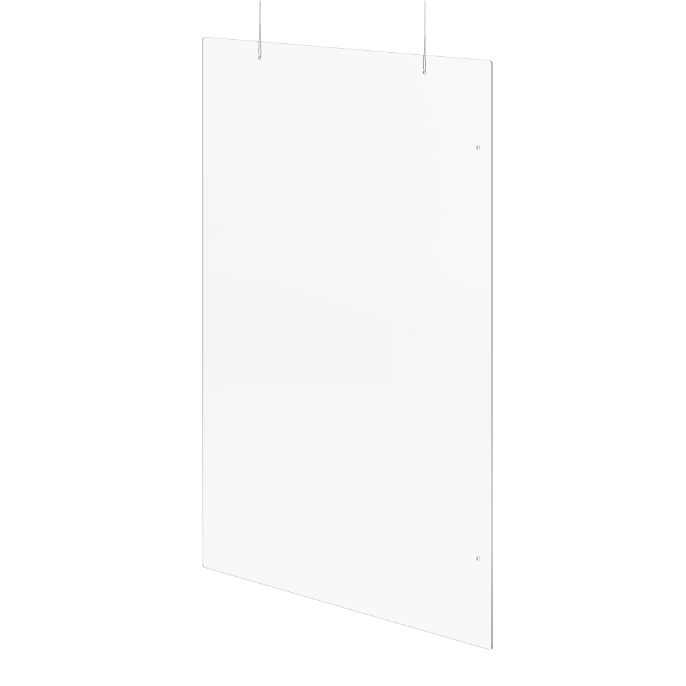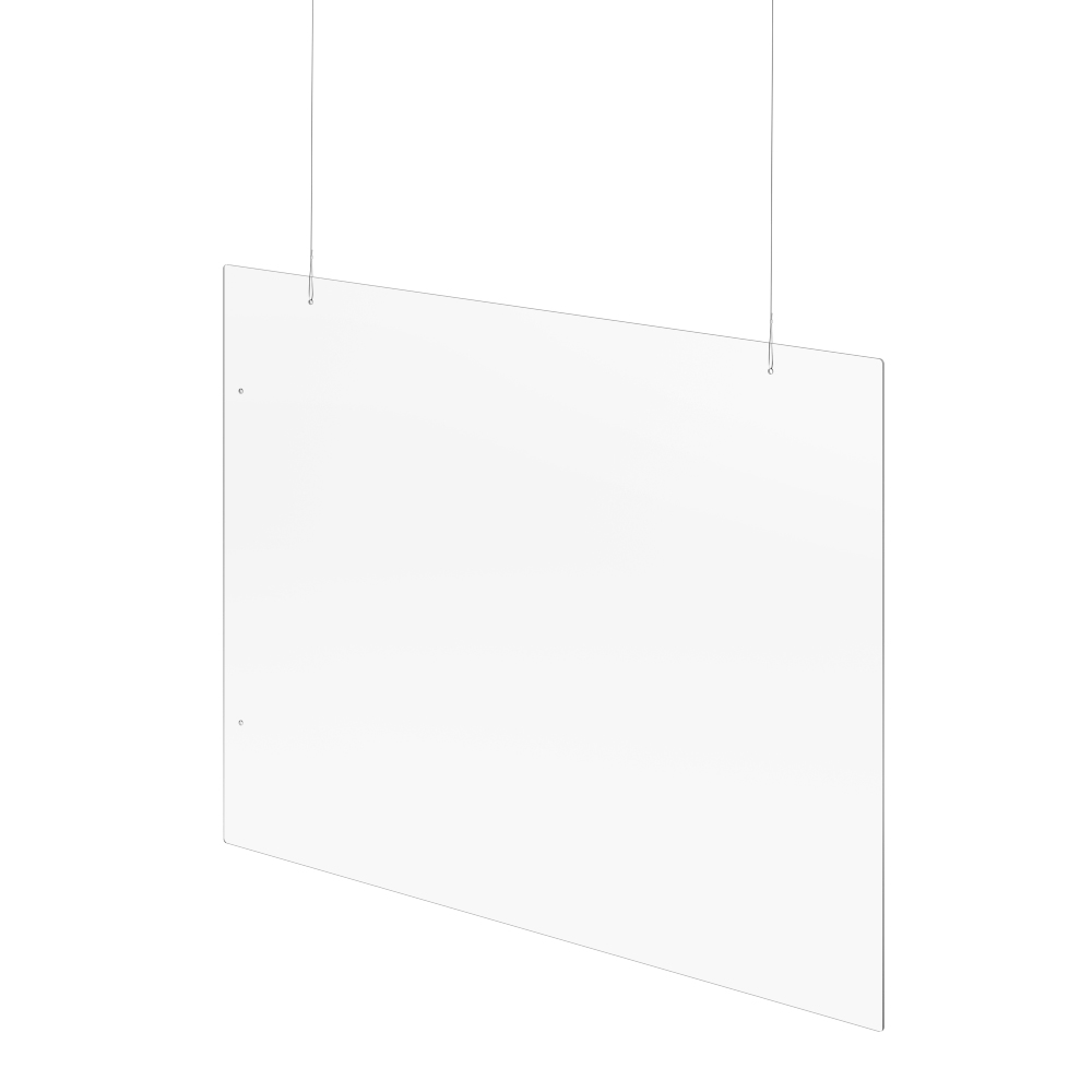 Hängender Schutzschild in elegantem Design aus 3 mm starkem Acrylglas. Mit 2 x 2,5 Meter Band zum Aufhängen. Dient als hygienischer Schutz Ihrer Besucher und Mitarbeiter.