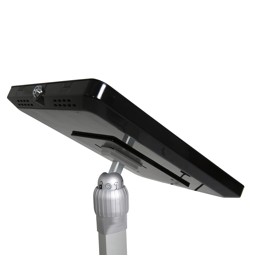 Der Tablet Halter kann eingestellt werden um den gewünschten Winkel zu erreichen und kann horizontal als auch vertikal verwendet werden. Er ist höhenverstellbar um sowohl in Sitzhöhe als auch Stehhöhe verwendet zu werden und ist geeignet für Tablets.