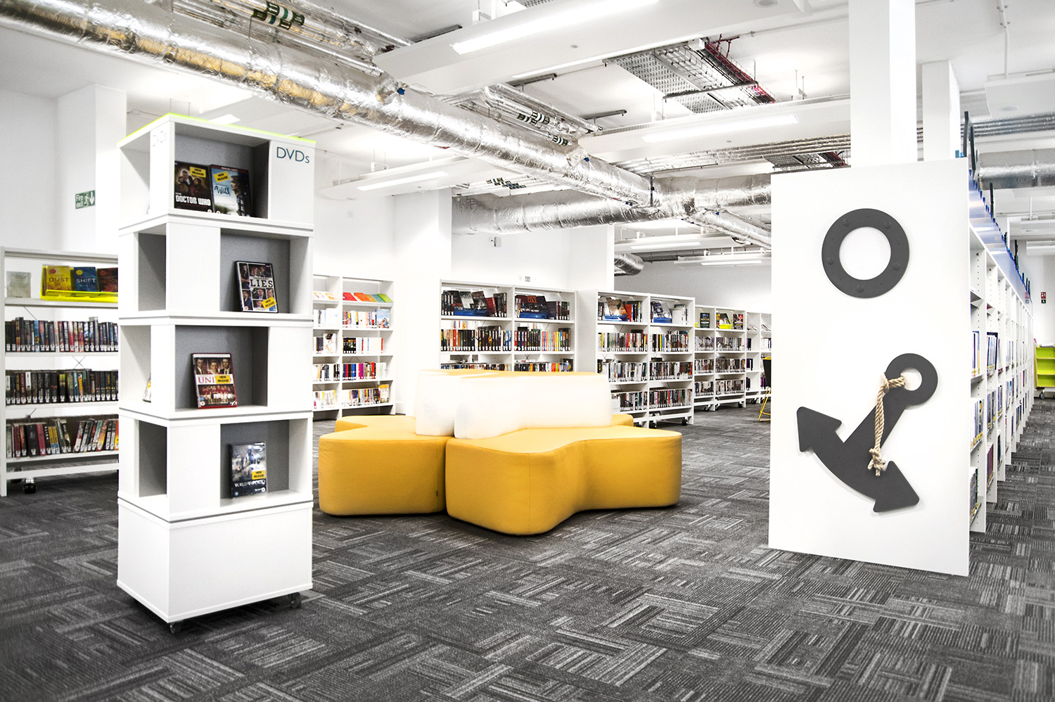 Thedesignconcept ltd. führte anregende und inspirierende Möbel, Gadget-Bars und digitale Technologie in diesen aufregenden Bibliotheksraum ein. Eine Reihe von PCs steht der Öffentlichkeit zur Verfügung, um auf das Internet zuzugreifen, eine Gadget-Bar bietet Lademöglichkeiten für Telefone und Laptops im "ruhigen" Lernbereich in der Bibliothek.