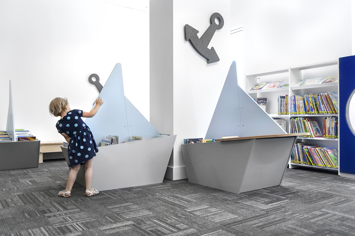 Einem maritimen Thema folgend, um die reiche Geschichte von Greenwich zu integrieren, wurde der Kinderbereich der Bibliothek mit bootsförmigen Browsern ausgestattet und die Regale umfassen Wellen, Anker und Bullaugen, die Kinder genießen können. Die Kinderbibliothek hält auch PCs und Tablets für die jüngeren Besucher bereit.