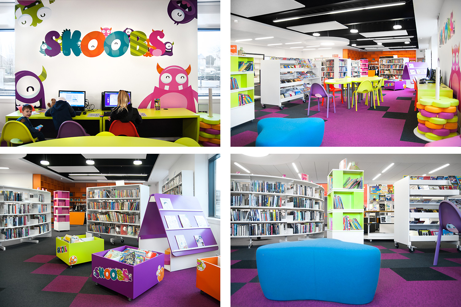 Rechts: Die Show-It-Display-Einheiten in Kombination mit Neon-Buchtürmen bieten optimale Display-Flexibilität und bringen noch lebendigere Farben in den Bibliotheksraum.