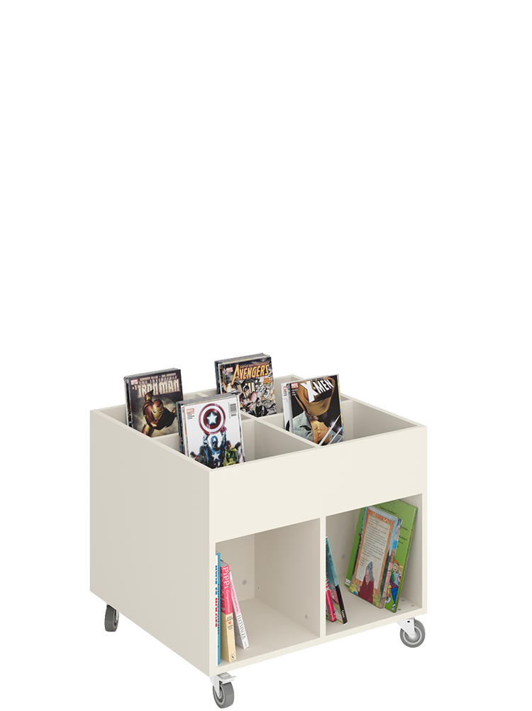 Funktionaler und moderner Trog, der in alle Zonen der Bibliothek passt, aber speziell für Kinderzonen geeignet ist.