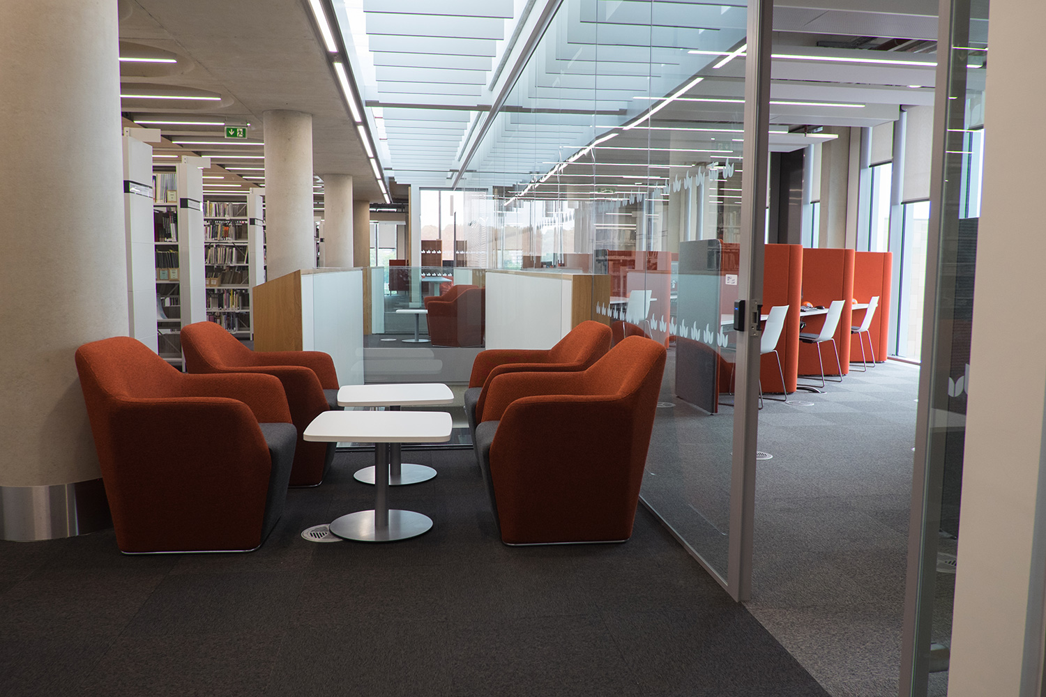 Messestände sind in verschiedenen Farbpaletten durch die Bibliothek zu sehen. Sessel mit hohen Rückenlehnen, reduzieren den Schall aus der Umgebung und sind in Arbeitsflächen integriert, und Pluto-Kraftwerke wurden hinzugefügt, die es den Schülern ermöglichen, Laptops anzuschließen und auch zwei USB-Anschlüsse zu haben. Fünf-Personen-Rundtisch / Schreibtisch für Computerbildschirme mit Einschalt- und Down-Option, um bei Bedarf eine bildschirmlose, flache Tischoberfläche bereitzustellen, Tastatur- und Mausgehäuse und integrierte Kabelrinne sind ebenfalls enthalten. In Zusammenarbeit mit dem bestehenden Regalsystem der Universität verleihen die Studienkabinen dem Raum ein modernes Gefühl und verleihen dem gesamten Raum eine Reihe von Farben.