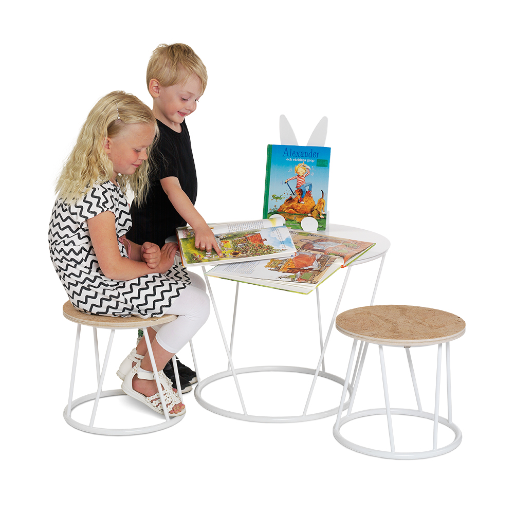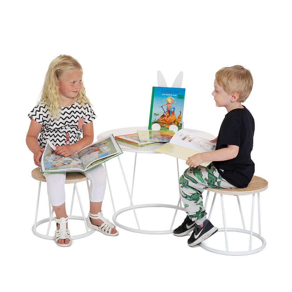 Zwei Stück runde Hocker für den Kinderbereich.