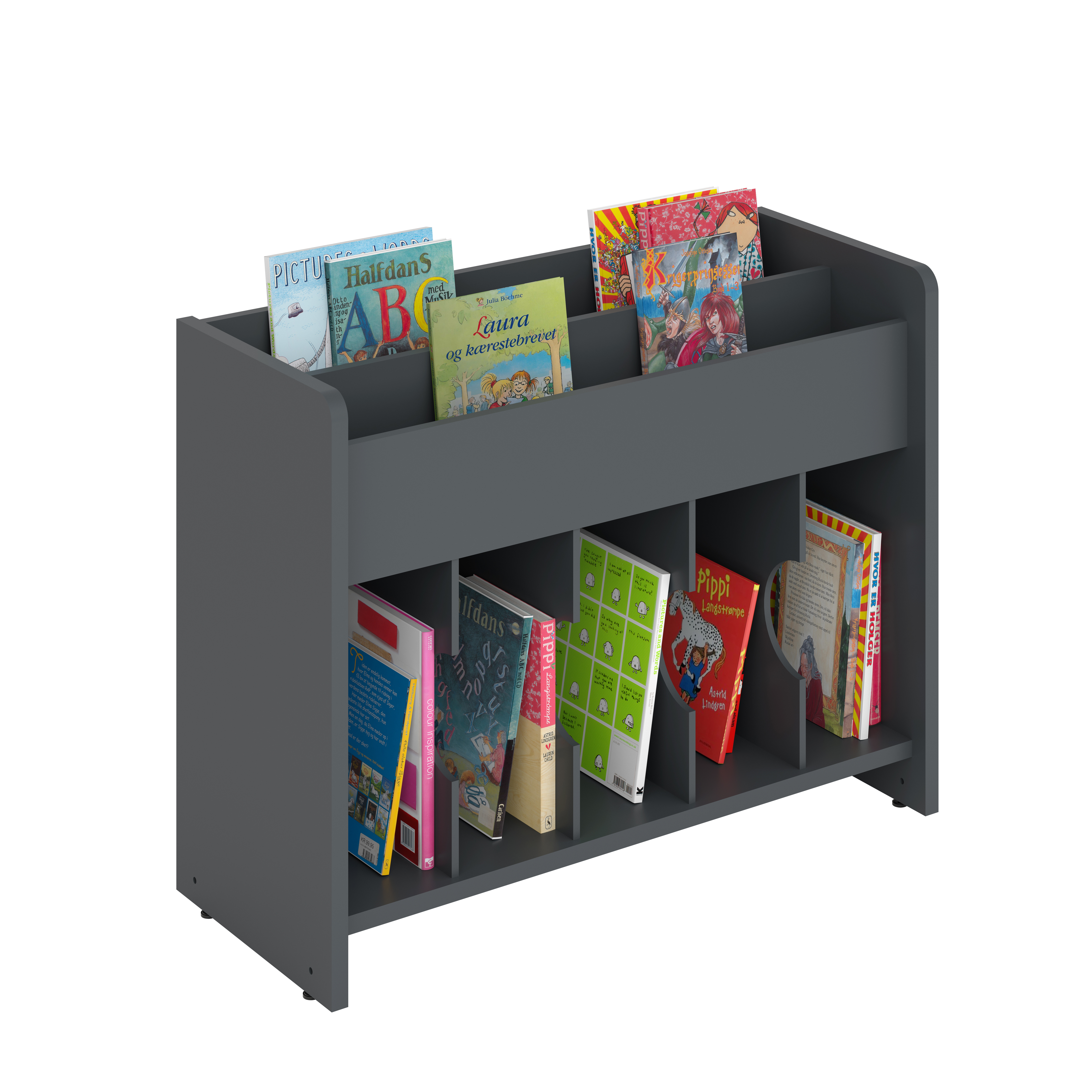 Bilderbuchtrog mit zwei Präsentationsfächern oben und funf Aufbewahrungsfächern unten.