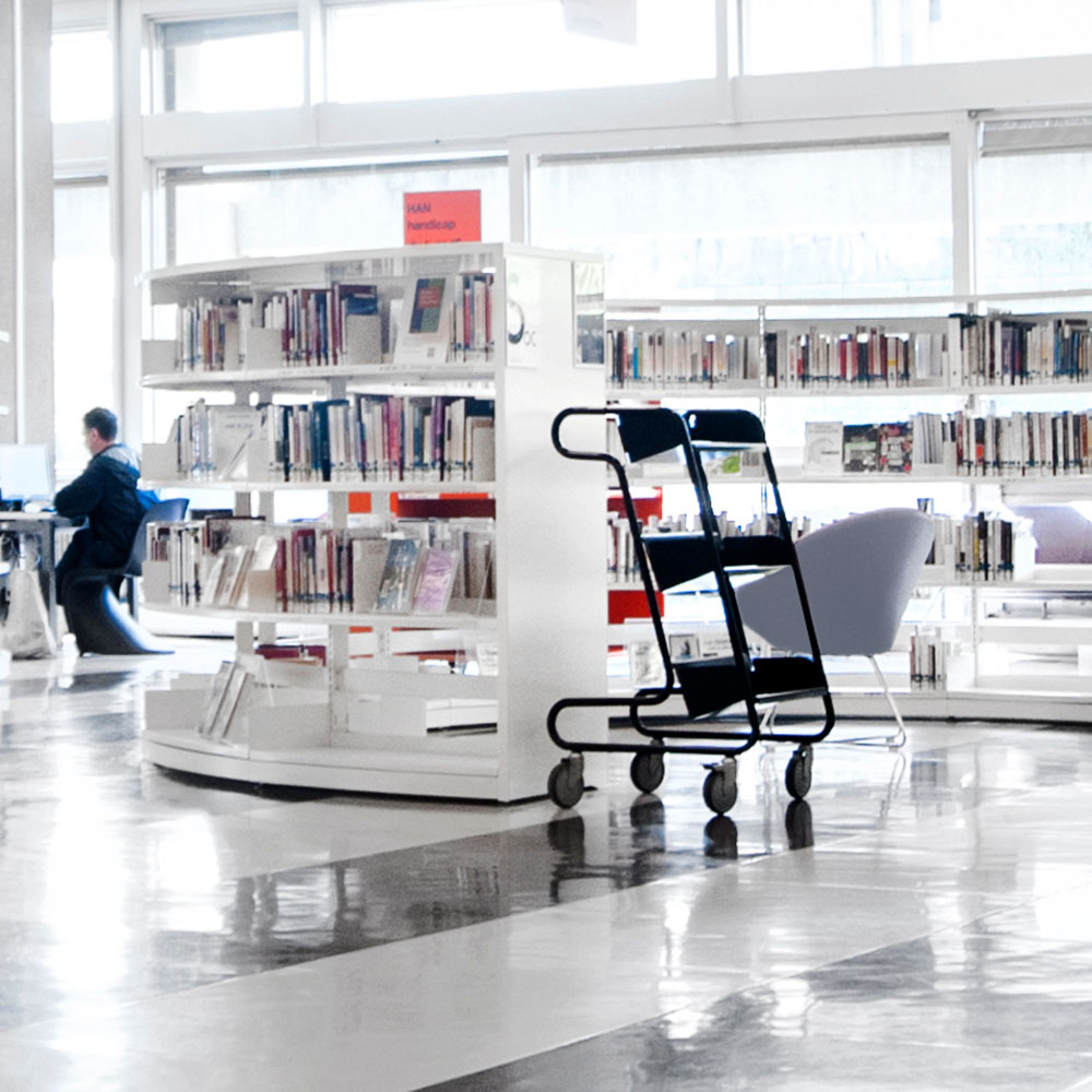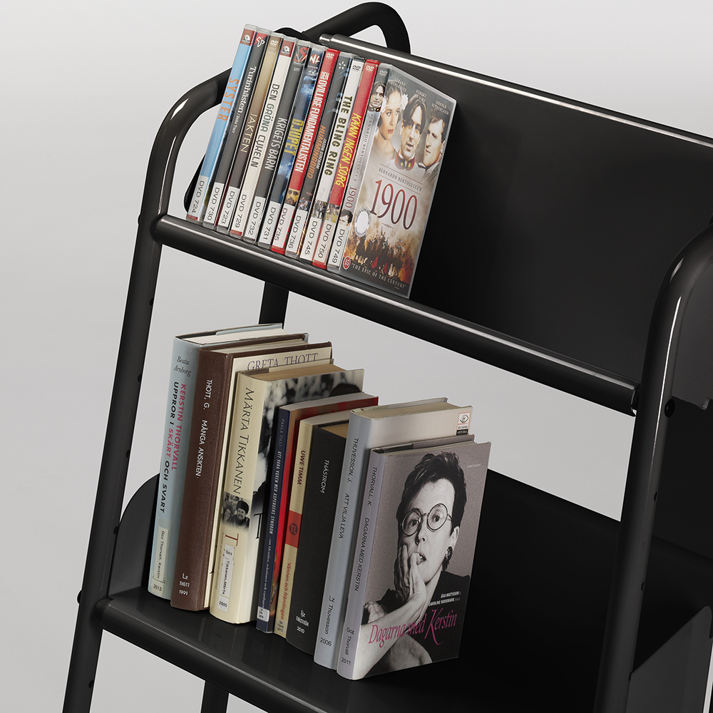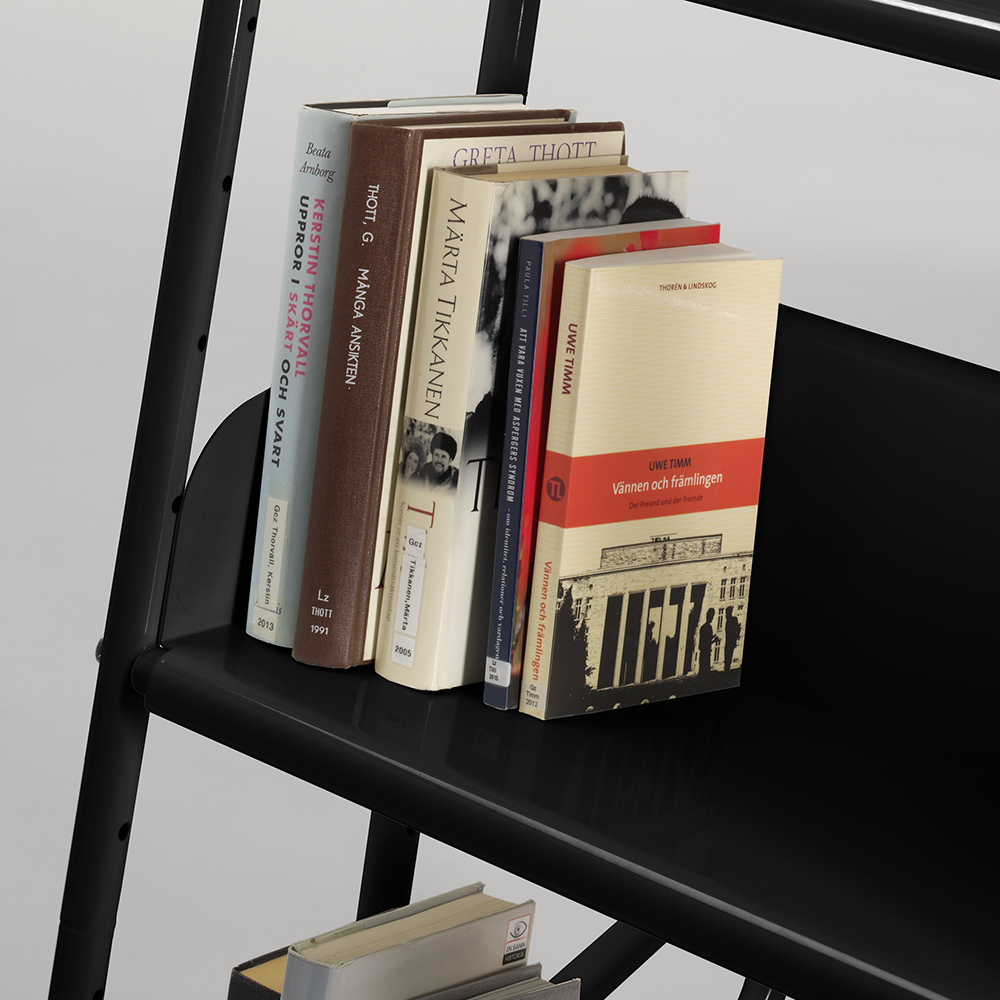 Die Neigung des Wagens sorgt für eine sichere Medienunterbringung und bietet eine gute Übersicht über die jeweiligen Bücher.