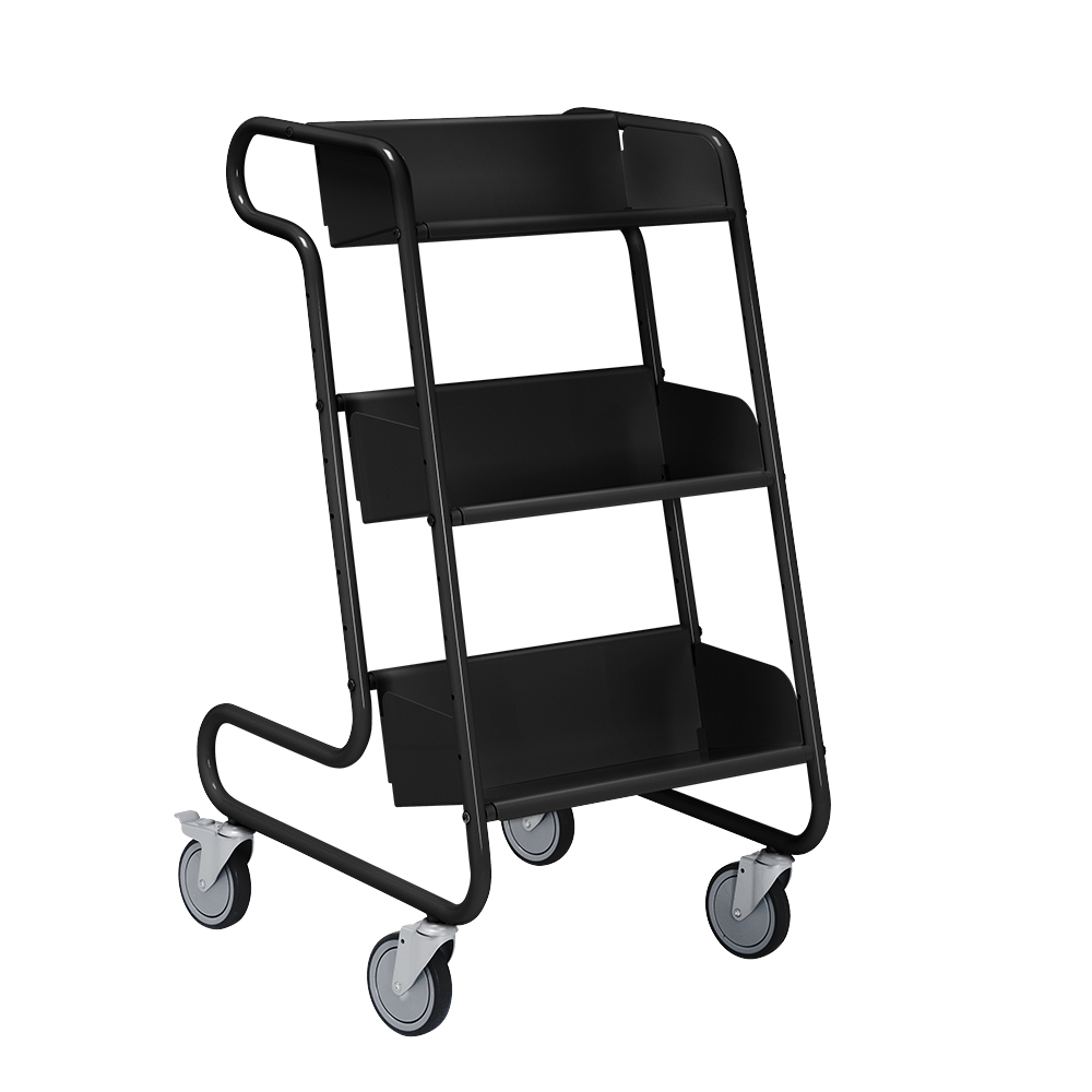 Einseitiger Bücherwagen mit drei geneigten Fachböden die entfernt und für verschiedene Arten von Büchern und CD/DVD Medien verwendet können.