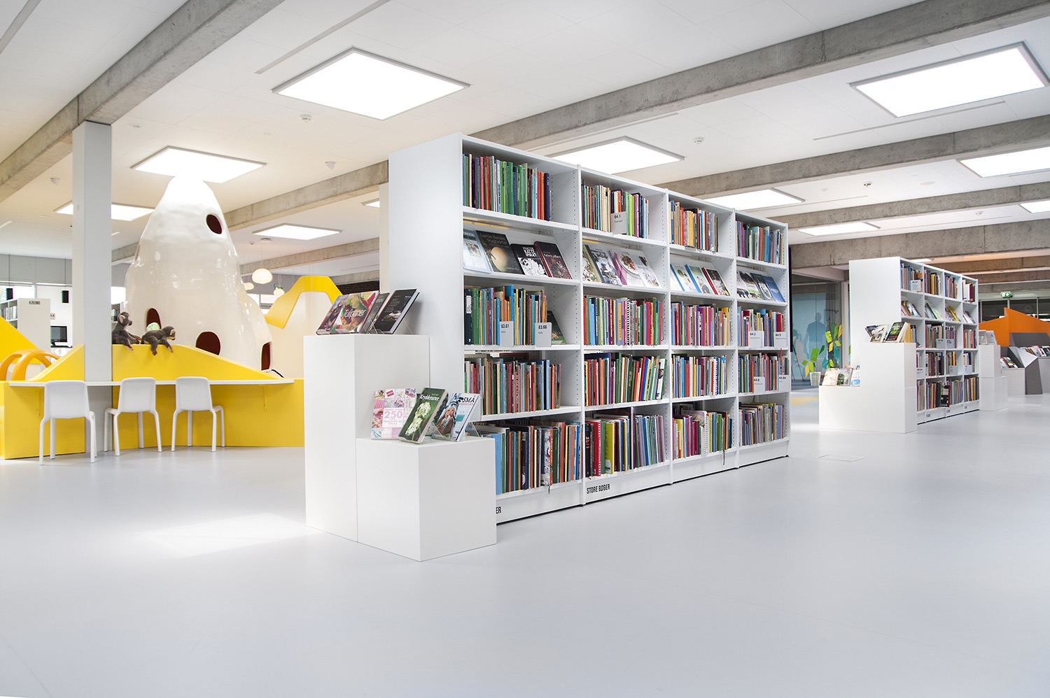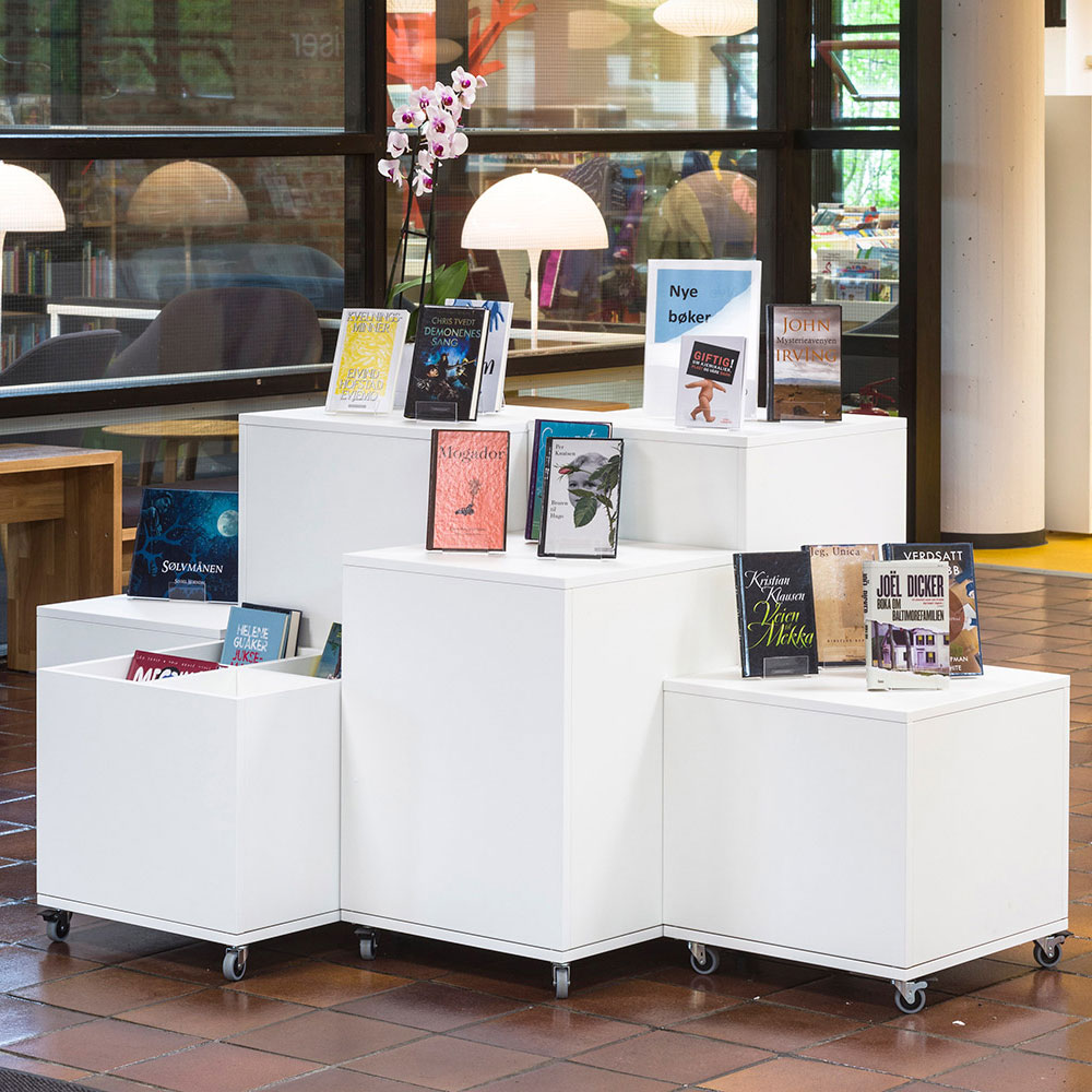 Maria ist eine Serie von Podien mit Trog erhältlich in zwei Größen (50 cm und XL 64 cm) und drei Höhen (Mini, Midi und Maxi) für flexible Bibliothekseinrichtungen.