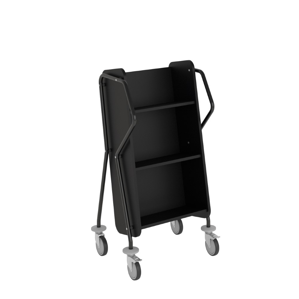 Einseitiger, abgeschrägter Bücherwagen mit drei Fachböden. Großzügiger Platz zwischen den Fachböden um größere Medien untzerzubringen.