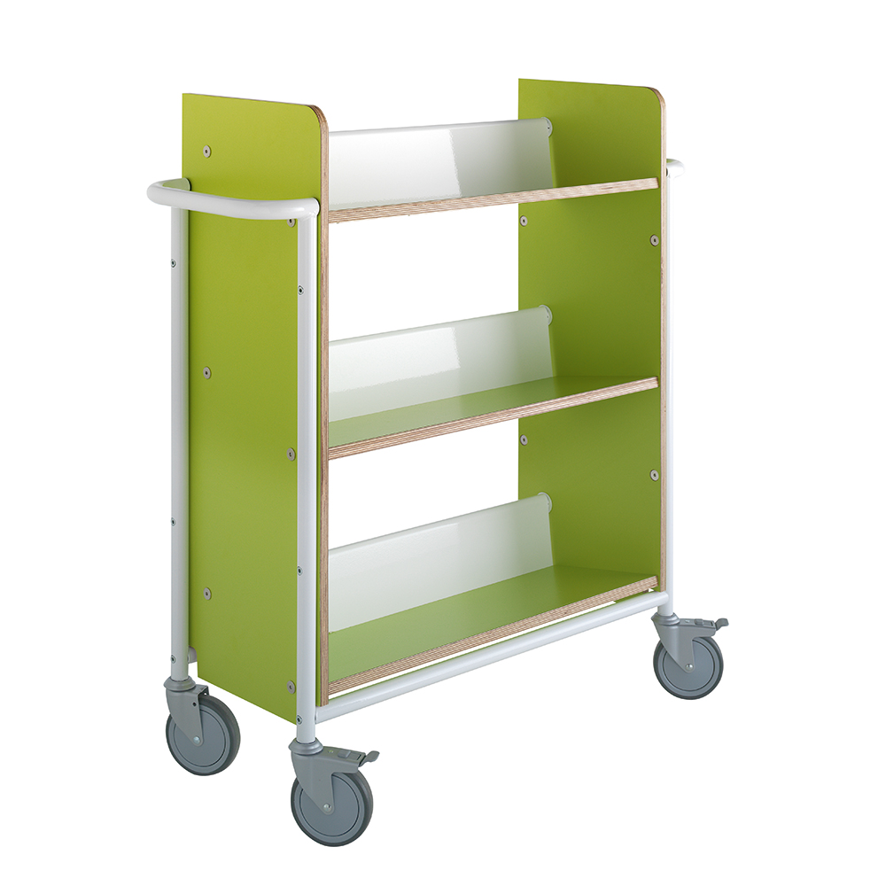 Einseitiger Wagen mit drei festen, rückwärts geneigten Fachböden. Die Neigung sorgt für eine sichere Medienunterbringung.