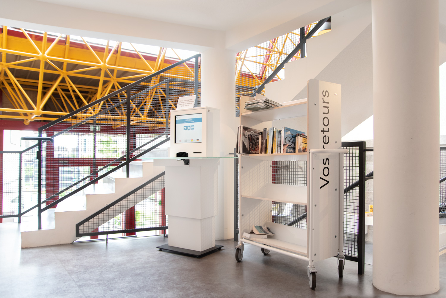 Einseitiger Wagen mit vier festen, rückwärts geneigten Fachböden. Die Neigung sorgt für eine sichere Medienunterbringung.