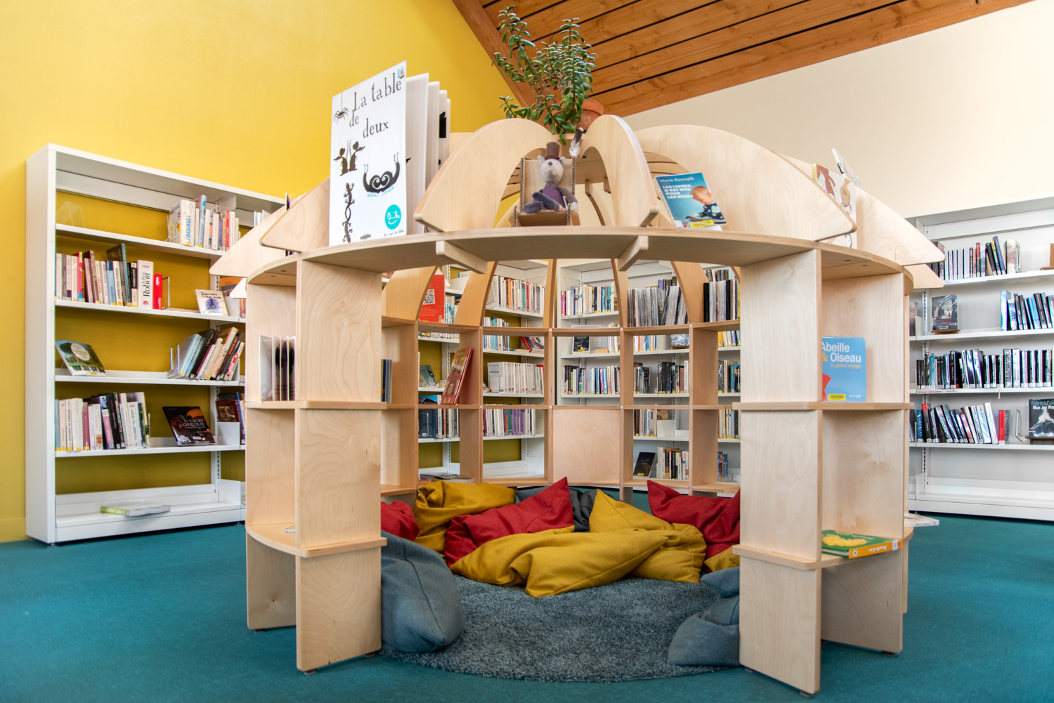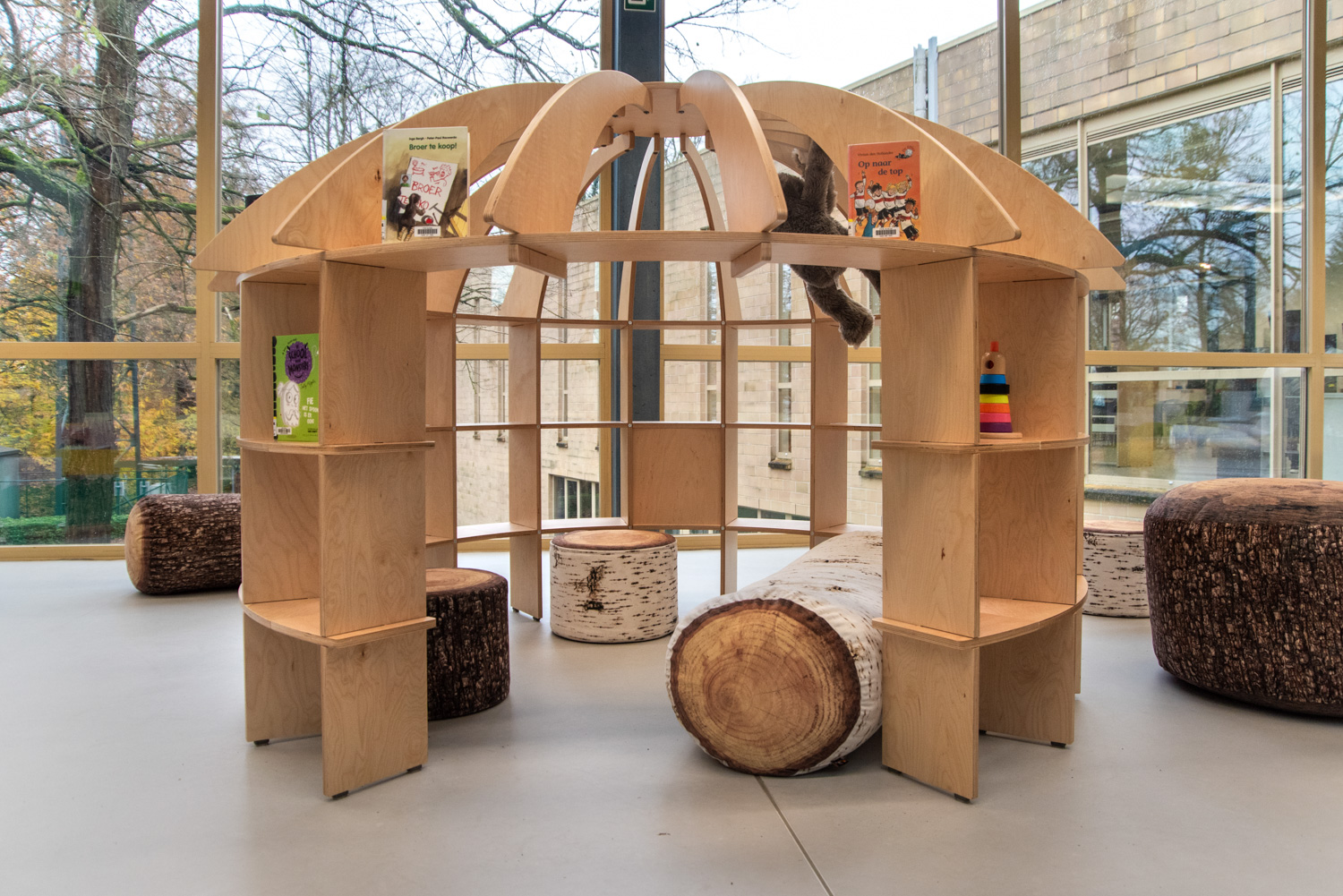 Die horizontalen Elementen verbinden die Konstruktion und bieten auf drei Ebenen reichlich Platz für Kinderbücher.
