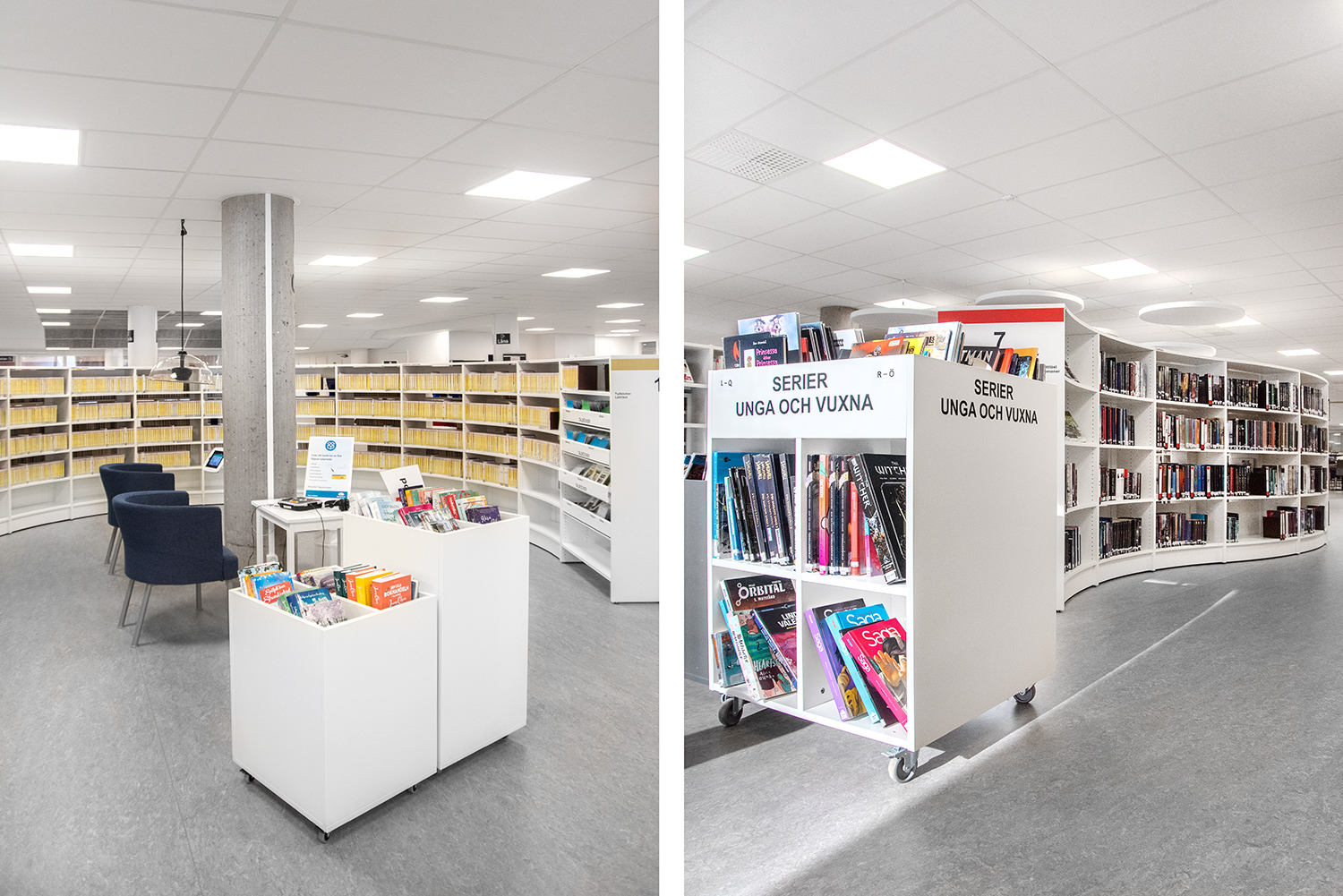Verwenden Sie Sara entweder freistehend oder zusammen mit weiteren Elementen als Raumteiler. Kombinieren Sie unterschiedliche Höhen und gestalten Sie so spannende Formen und Landschaften in Ihrer Bibliothek.