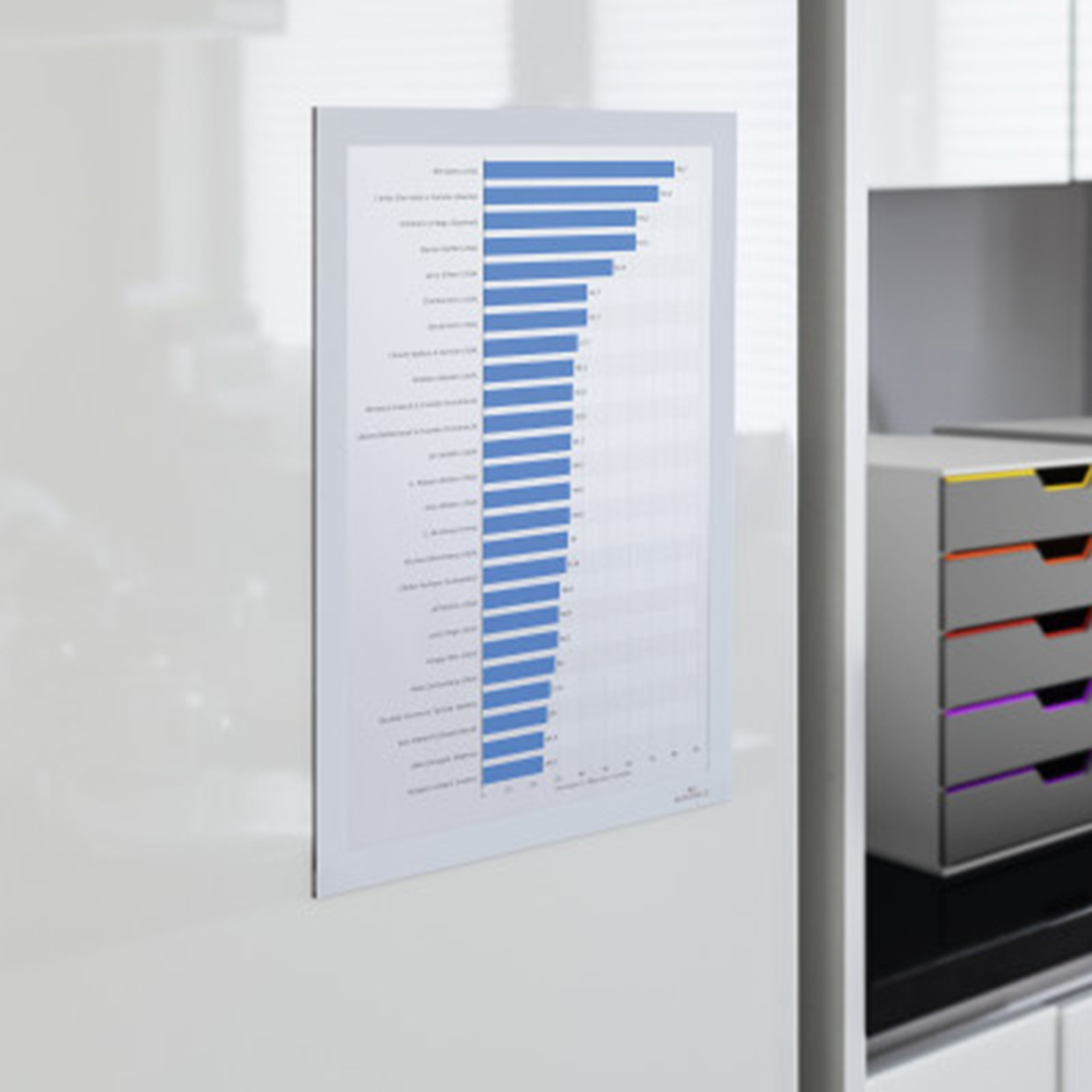 Der selbsthaftender magnetische Inforahmen (Duraframe®) kann einfach an eine glatte Tür, Wand, sowie Regalseiten usw angebracht werden.