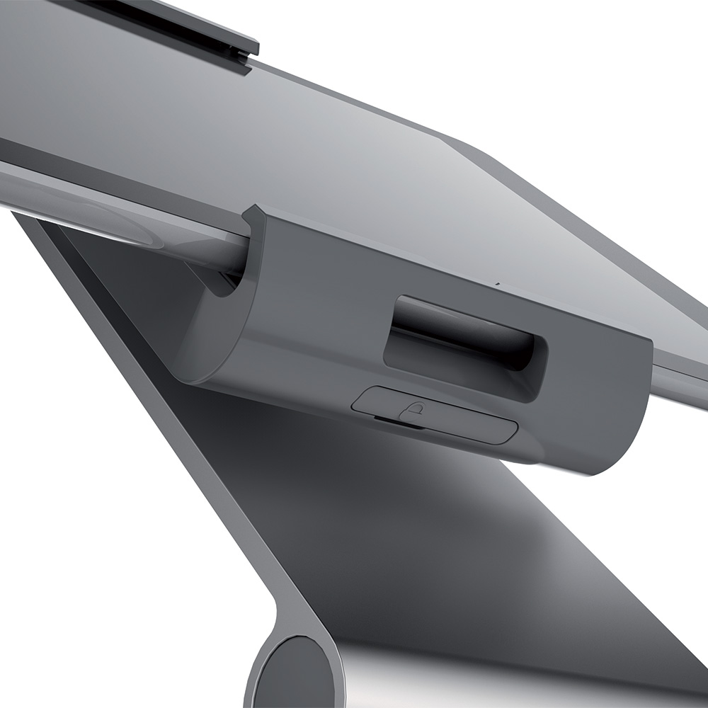 Das Tablet ist in die Halterung verriegelt, sodass es nicht herausnehmbar ist. Passend für Tablets von 7" bis 13".