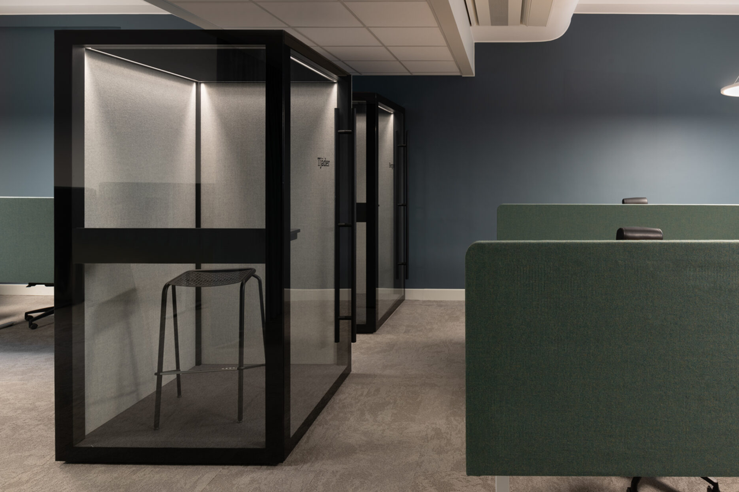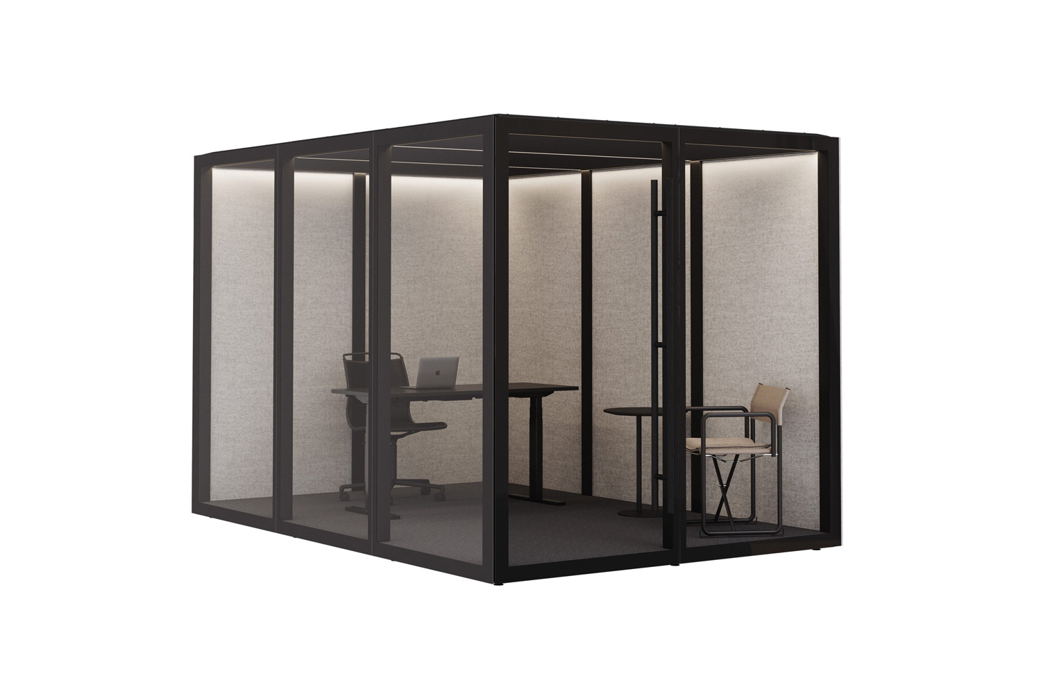 Zen Pod® kombiniert hochentwickelte schallabsorbierende Technologie mit elegantem Design. Zwei Wände sind mit Akustikglas ausgestattet, während die übrigen Wände schallabsorbierend sind und sowohl innen als auch außen mit Textilien verkleidet sind. Die Decke bietet ebenfalls Schalldämmung mit angenehmer Beleuchtung.